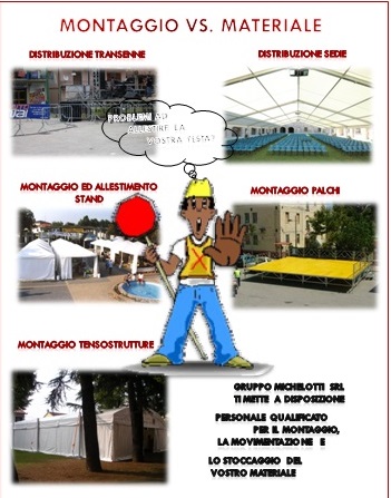 Gruppo Michelotti s.r.l., vi propone la sola manodopera necessaria al montaggio delle vostre strutture già posizionate in loco, con una tariffa oraria o con un costo forfettizzato; oppure il servizio completo con recupero del materiale nei vostri magazzini e successivo ricovero, il tutto sempre a costi convenzionati.